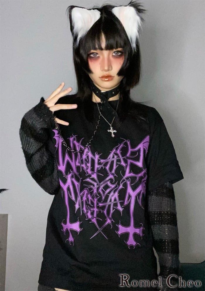 【お支払い確認後20日以内発送】RomelCheo バット逆さクロス病みゴシック半袖Tシャツ グラフィックTシャツ デザインTシャツ オーバーサイズ ゆったり パンク ロック ダークロック ゴスロリ 病み系 レディース モード系 ファッション 原宿系 青文字系 カジュアル ファッション ロメルチェオ