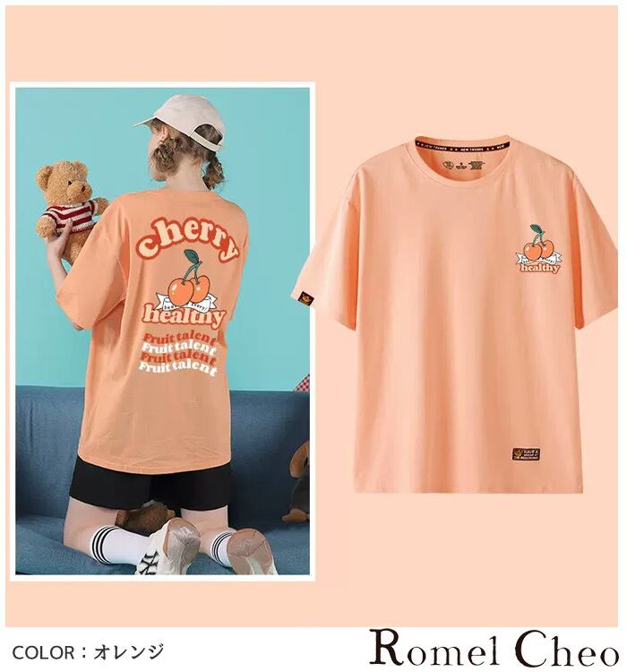 【お支払い確認後20日以内発送】RomelCheo POPチェリー半袖Tシャツ オーバーサイズTシャツ グラフィックTシャツ バックプリントTシャツ ビッグシルエット ドロップショルダー レディース モード系 ストリート ファッション 原宿系 サロン系 青文字系 カジュアル ファッション ロメルチェオ