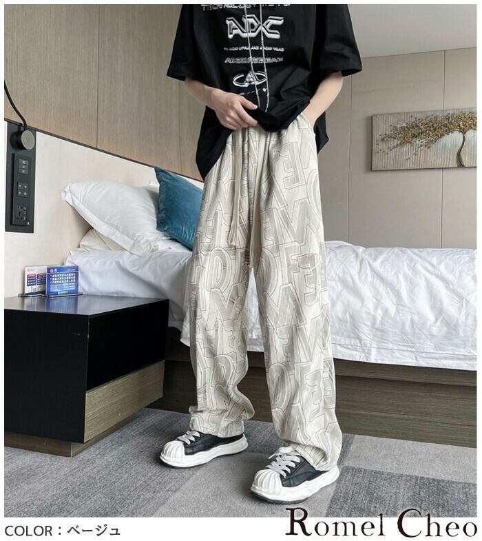 【お支払い確認後20日以内発送】RomelCheo ロゴ総柄イージーパンツ ワイドパンツ ワイドレッグパンツ 総柄パンツ デザインパンツ タイパンツ ゆったり オーバーサイズ ルーズシルエット ストレートパンツ メンズ モード系 ストリート 原宿系 青文字系 サロン系 ファッション ロメルチェオ