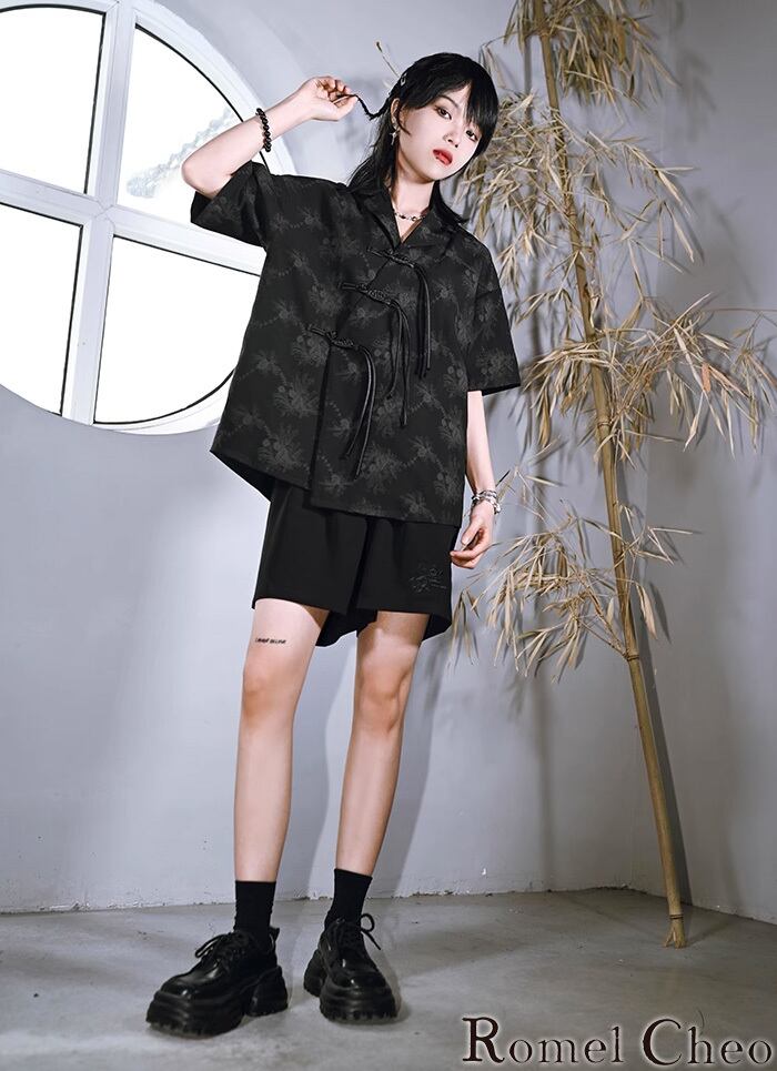 【お支払い確認後20日以内発送】RomelCheo チャイナボタン ポロシャツ レディース アシンメトリー シャツ 夏 チャイナボタンシャツ オーバーサイズシャツ オープンカラーシャツ オーバーサイズ モード系 ストリート サロン系 個性的 原宿系 青文字系 カジュアル ファッション ロメルチェオ