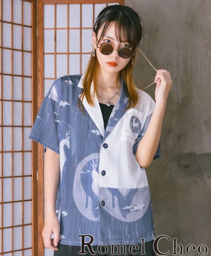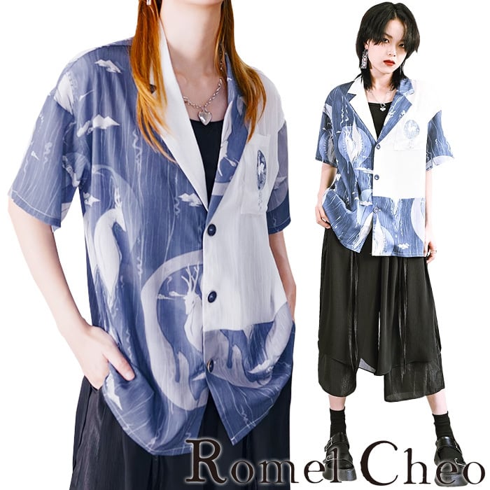 【お支払い確認後20日以内発送】RomelCheo 刺繍 ポロシャツ レディース 半袖シャツ オーバーサイズシャツ デザインシャツ オープンカラーシャツ 総柄シャツ ドロップショルダー 切り替え 半袖 モード系 ストリート サロン系 個性的 原宿系 青文字系 カジュアル ファッション ロメルチェオ