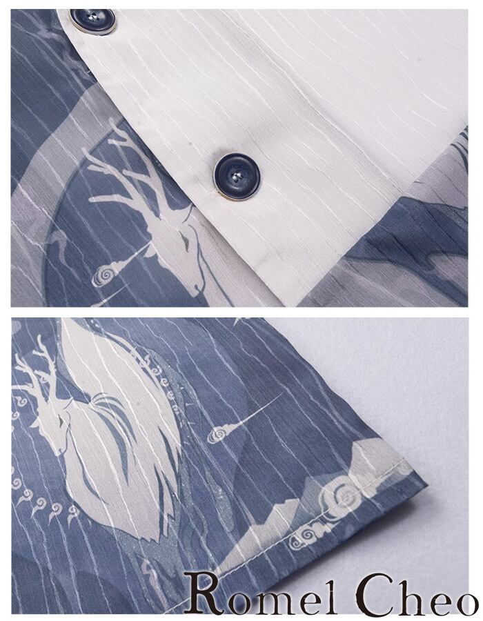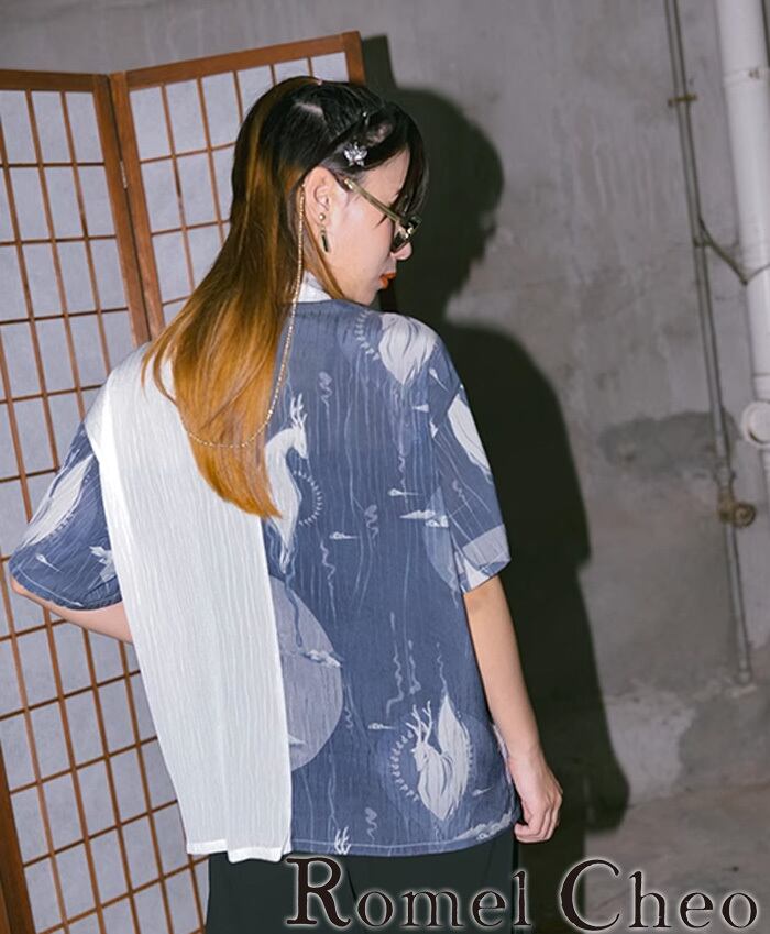 アジアンテイストな幻想的なグラフィックと総柄が個性的でお洒落な半袖シャツになります。