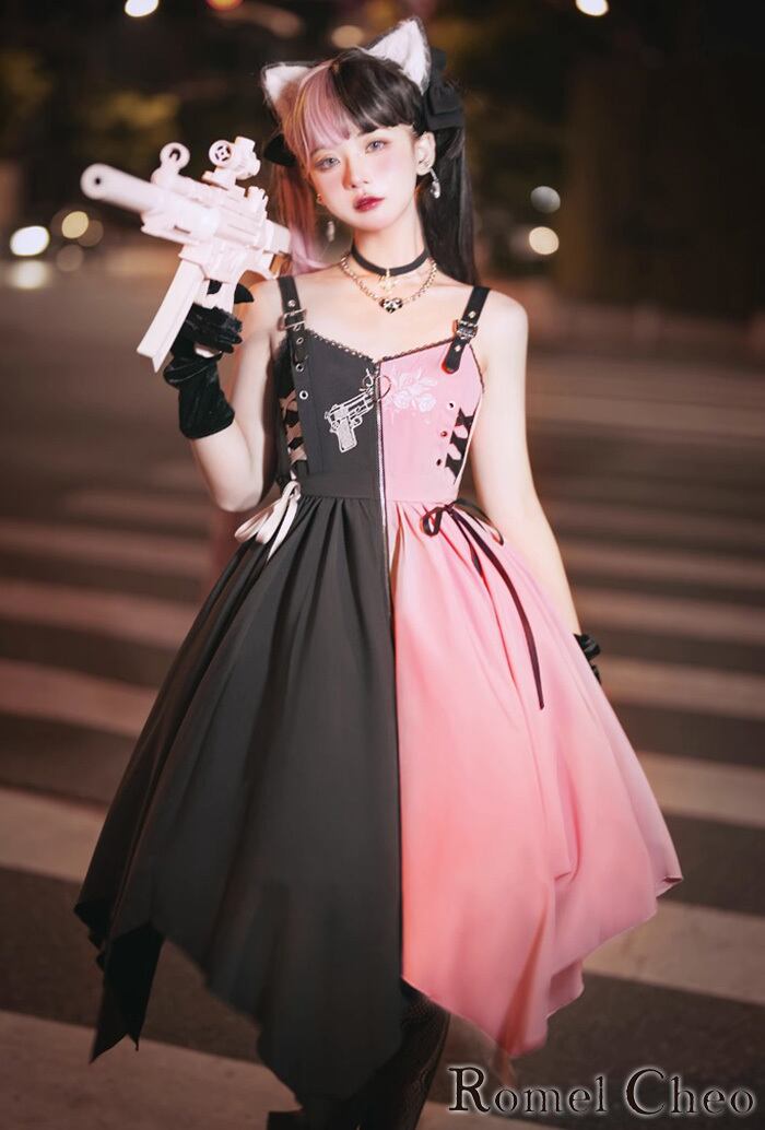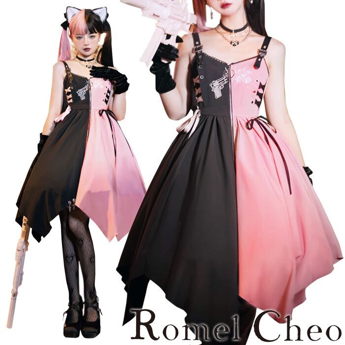 【お支払い確認後20日以内発送】RomelCheo ゴスロリバイカラーストラップワンピ ロリータワンピ バイカラーワンピ リボンワンピ ミモレ丈 ハイウエスト ゆめかわいい 病みかわいい ゴスロリ レディース モード系 ファッション 原宿系 青文字系 カジュアル ファッション ロメルチェオ
