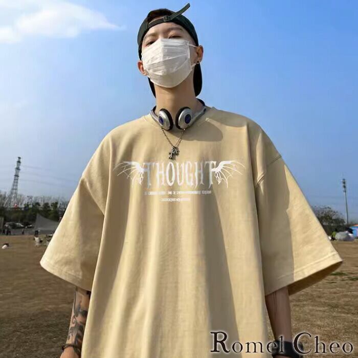 【お支払い確認後20日以内発送】RomelCheo ローズニュースペーパー半袖Tシャツ オーバーサイズTシャツ グラフィックTシャツ バックプリント ドロップショルダー ビッグシルエット メンズ モード系 ストリート ファッション 原宿系 サロン系 青文字系 カジュアル ファッション ロメルチェオ