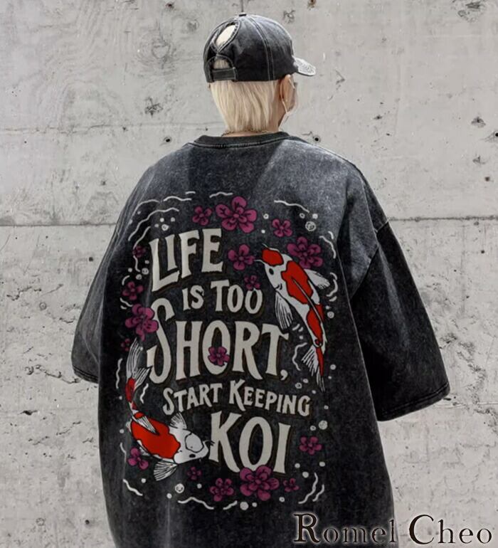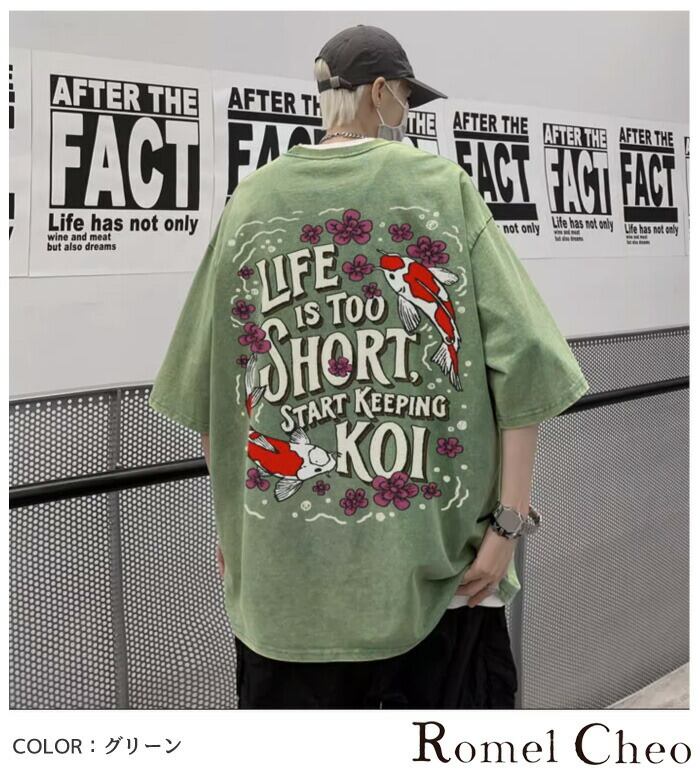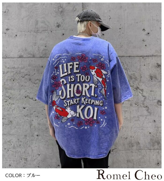 【お支払い確認後20日以内発送】RomelCheo レトロアメカジ鯉柄半袖Tシャツ オーバーサイズTシャツ グラフィックTシャツ バックプリント ドロップショルダー ビッグシルエット ゆったり メンズ モード系 ストリート ファッション 原宿系 サロン系 青文字系 カジュアル ファッション ロメルチェオ