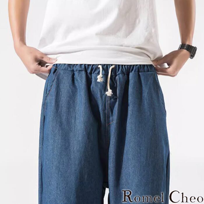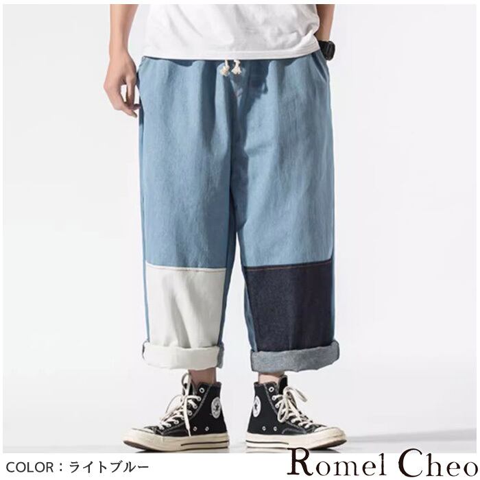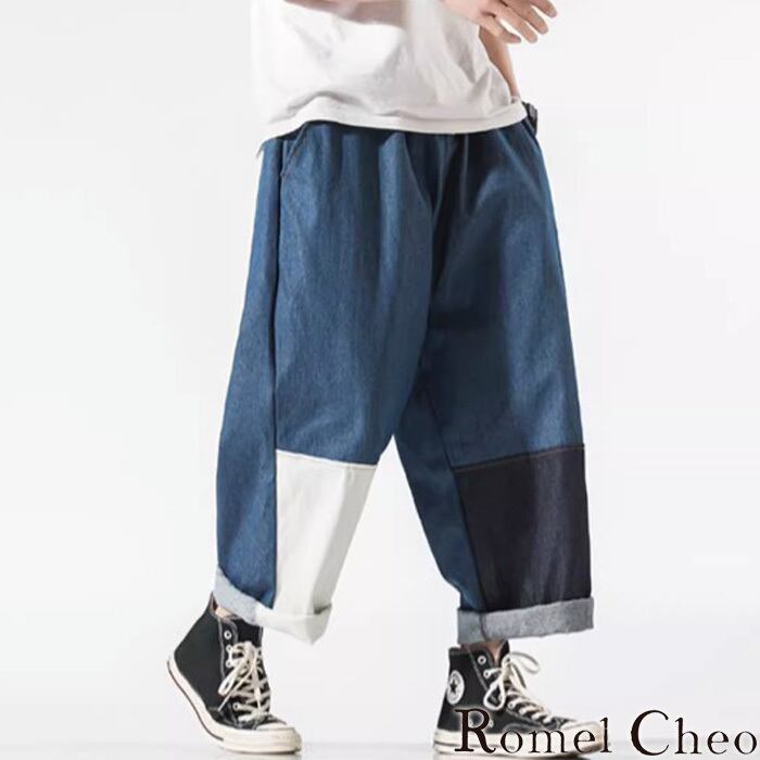 【お支払い確認後20日以内発送】RomelCheo サルエル風 デニムパンツ ゆったり ワイドレッグパンツ パッチワークデニムパンツ オーバーサイズデニム 切り替え ロールアップ ダボパンツ ウエストゴム メンズ 個性的 モード系 ストリート 原宿系 青文字系 サロン系 ファッション ロメルチェオ
