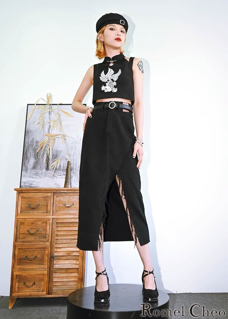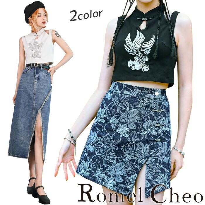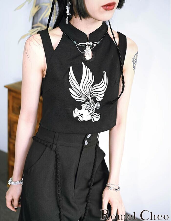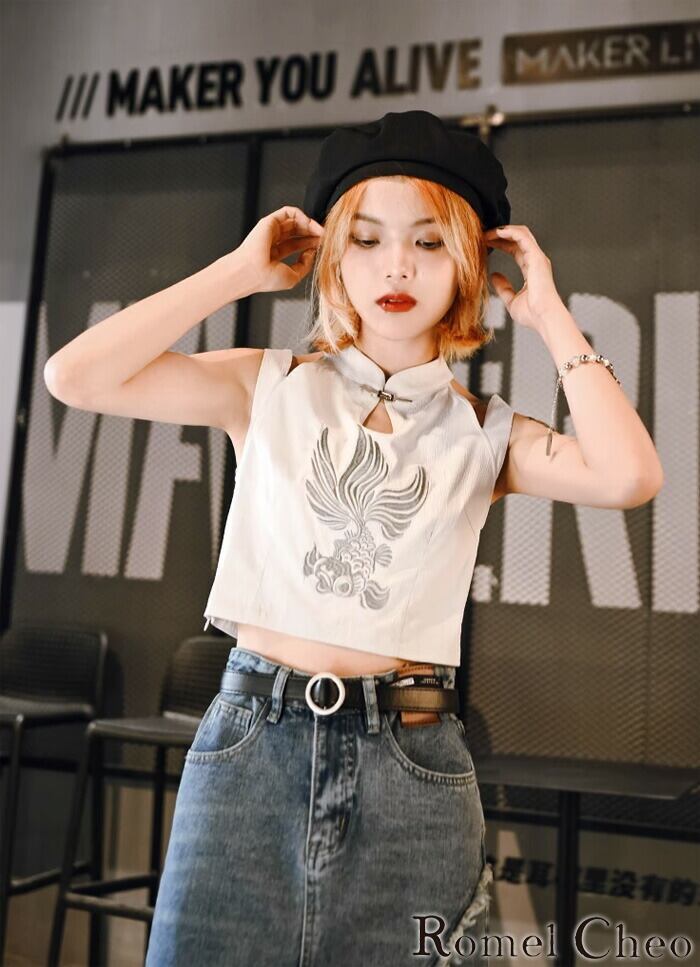 【お支払い確認後20日以内発送】RomelCheo 金魚刺繍 タンクトップ レディース シャツ オフショル ノースリーブ ホルターネック チャイナシャツ ショート丈 アジアン エスニック 個性的 レディース モード系 ストリート サロン系 個性的 原宿系 青文字系 カジュアル ファッション ロメルチェオ