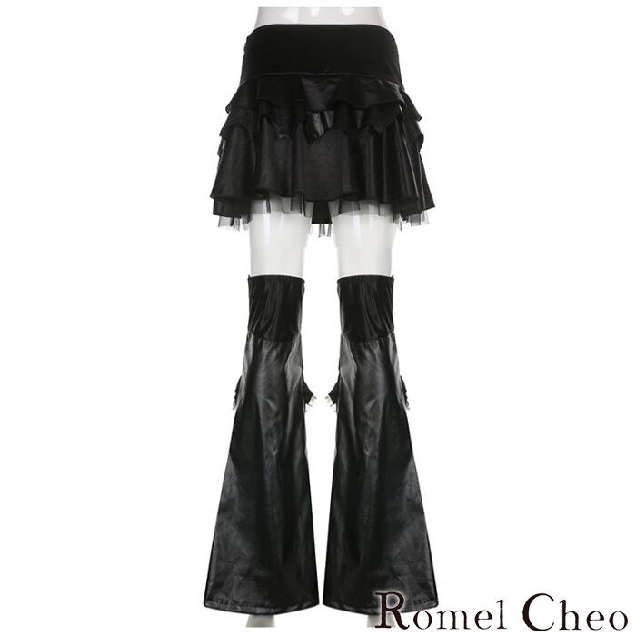 【お支払い確認後20日以内発送】RomelCheo フェイクレザーフレアミニメタルバックルパンツ ミニスカート ミニ丈 デザインスカート レッグカバー レッグウォーマー フレアレッグパンツ レディース カジュアル モード系 ストリート 原宿系 青文字系 サロン系 ファッション ロメルチェオ