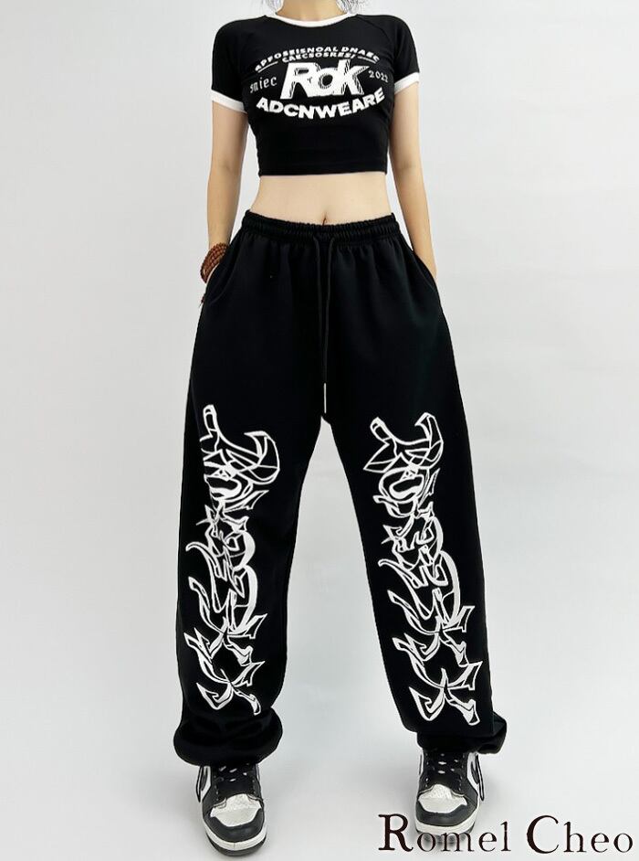 【お支払い確認後20日以内発送】RomelCheo ヒップホップダンスロゴパンツ ワイドパンツ ワイドレッグパンツ オーバーサイズ ルーズシルエット スウェットパンツ トラックパンツ ゆったり レディース カジュアル モード系 ストリート 原宿系 青文字系 サロン系 ファッション ロメルチェオ