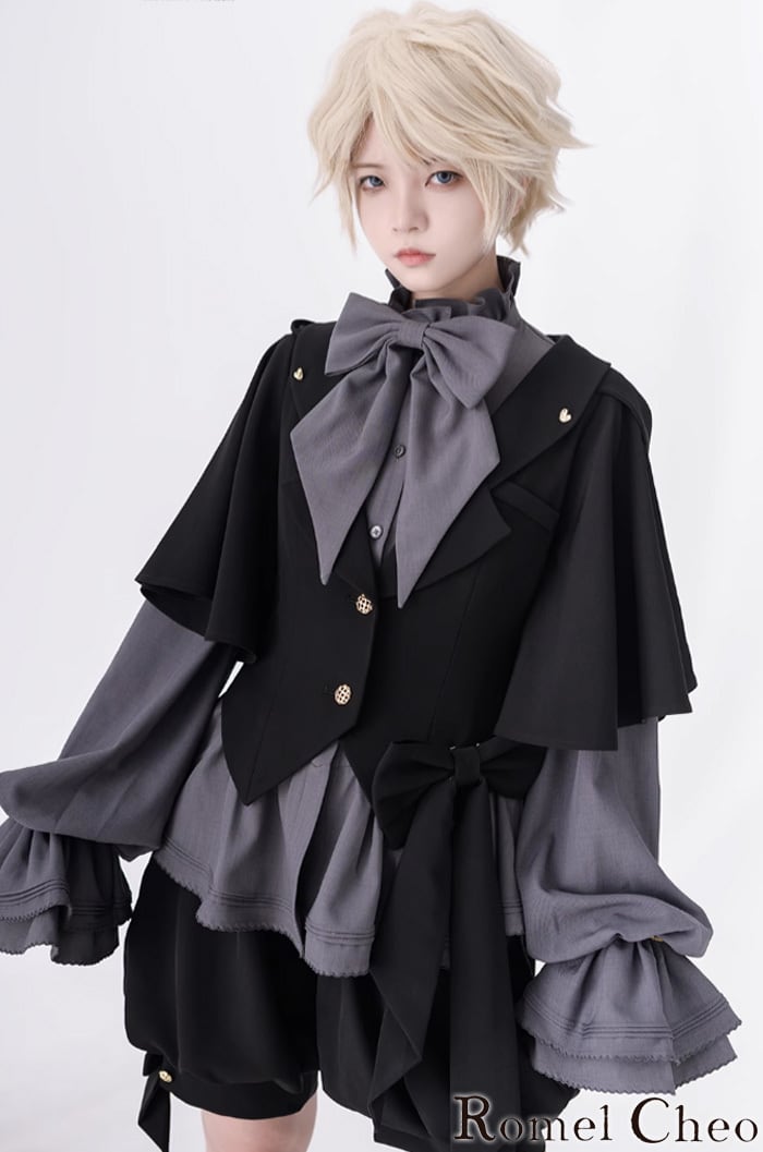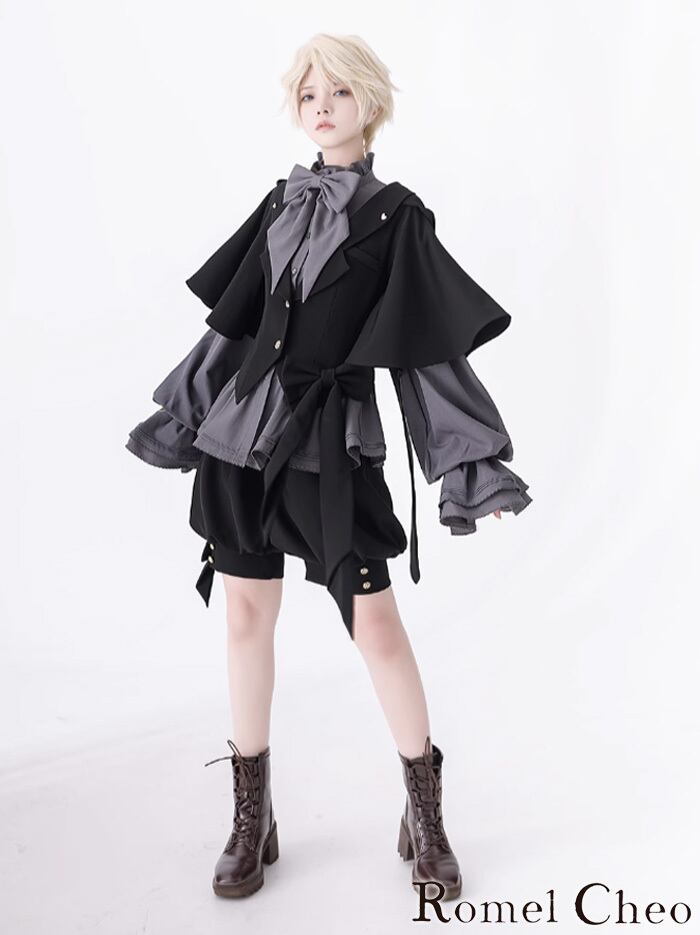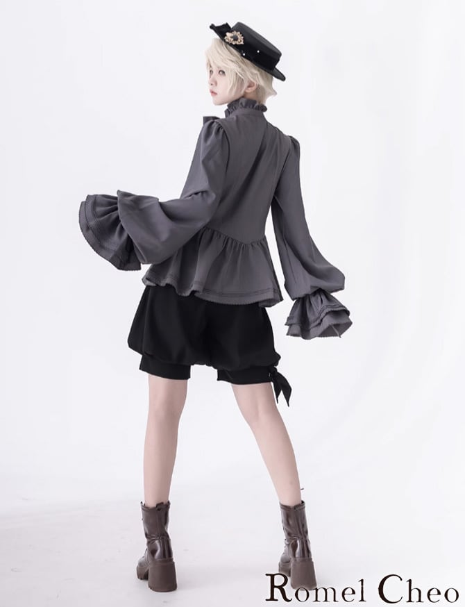 【RomelCheo】ダークキュートリボンタイブラウス フレアスリーブ リボンブラウス ボリュームスリーブ 長袖 スタンドカラー シャツ モダン ロリータ カジュロリ フェミニン レディース モード系 ストリート 原宿系 青文字系 ファッション 個性的 ロメルチェオ