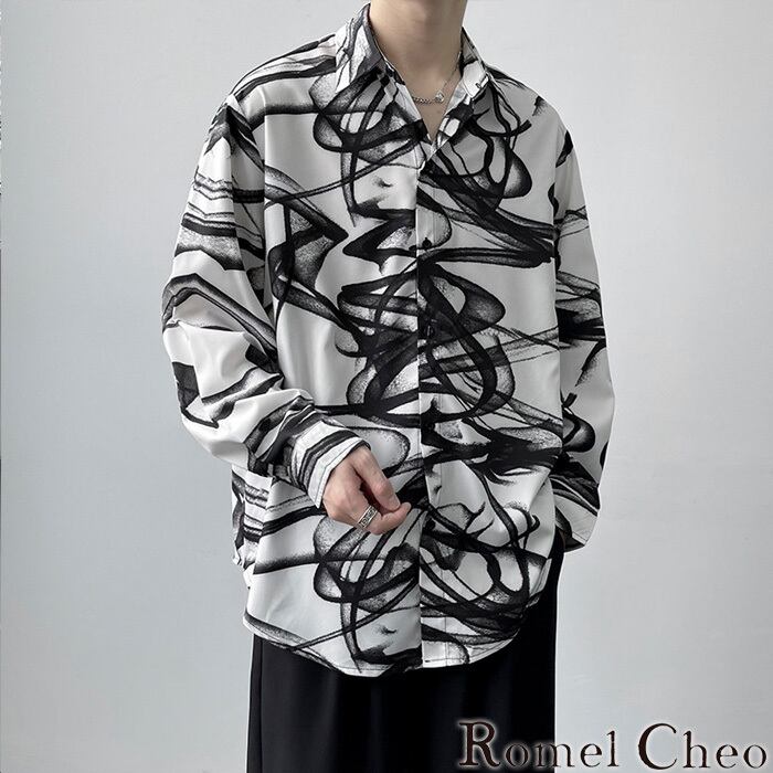 【お支払い確認後20日以内発送】RomelCheo モノクロマーブリング長袖シャツ 総柄シャツ 柄シャツ ダボシャツ オーバーサイズ ゆったり ドロップショルダー ボリューム袖 長袖 モノトーン タックイン メンズ モード系 ストリート 原宿系 サロン系 青文字系 ファッション 個性的 ロメルチェオ
