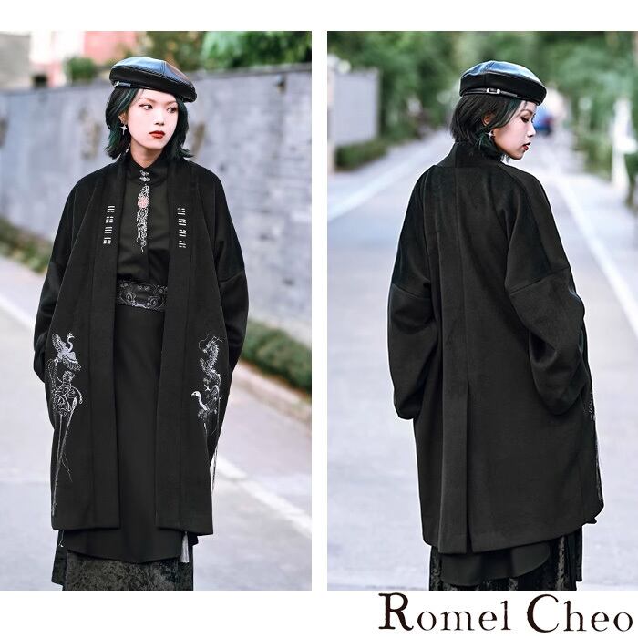 【お支払い確認後20日以内発送】 RomelCheo 和柄刺繍 ロングジャケット 秋冬 羽織 レディース 和風 モノトーン 羽織りカーデ カーディガン オーバーサイズ ゆったり 龍 虎 鳳凰 レトロ アジアン エスニック レディース モード系 ストリート 原宿系 青文字系 ファッション 個性的 ロメルチェオ