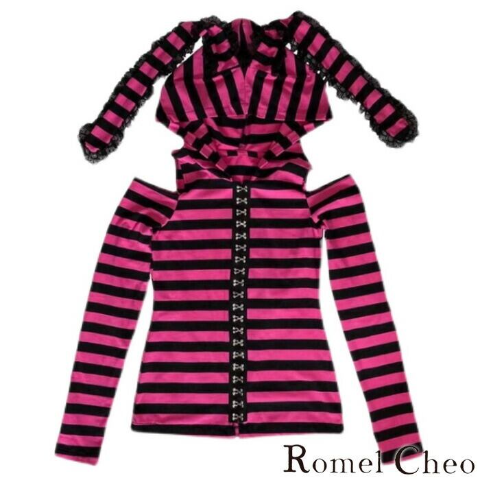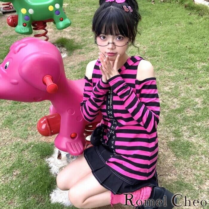 【お支払い確認後20日以内発送】RomelCheo うさ耳オプショルボーダーロンT ボーダーカットソー オフショルダーロンT ボーダーTシャツ 肩見せ ボーダー柄 ウサ耳フード フード付き デザインカットソー カジュアル ロリータ カジュロリ パンク 病み系 レディース モード系 ストリート 原宿系