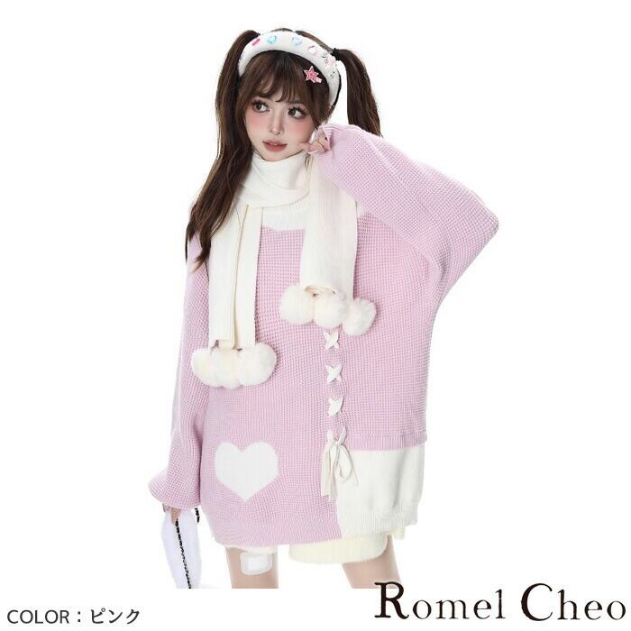 【お支払い確認後20日以内発送】RomelCheo マフラー付き量産型スィートハートセーター ロリータニット デザインニット オーバーサイズニット ボリューム袖 ドロップショルダー ゆったり 長袖 カジュアル ロリータ スウィートロリータ 甘ロリ 病み系 レディース モード系 ストリート 原宿系