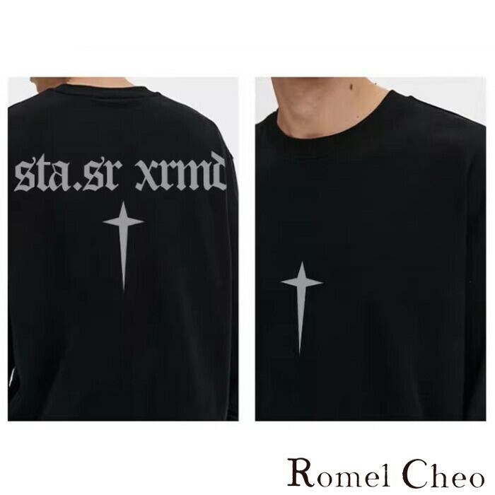 【お支払い確認後20日以内発送】RomelCheo シャイニングスターバックロゴ長袖Tシャツ グラフィックロンT デザインロンT 長袖カットソー Tシャツ クルーネック ゆったり ロングスリーブ アメカジ メンズ モード系 ストリート 原宿系 サロン系 青文字系 ファッション 個性的 ロメルチェオ