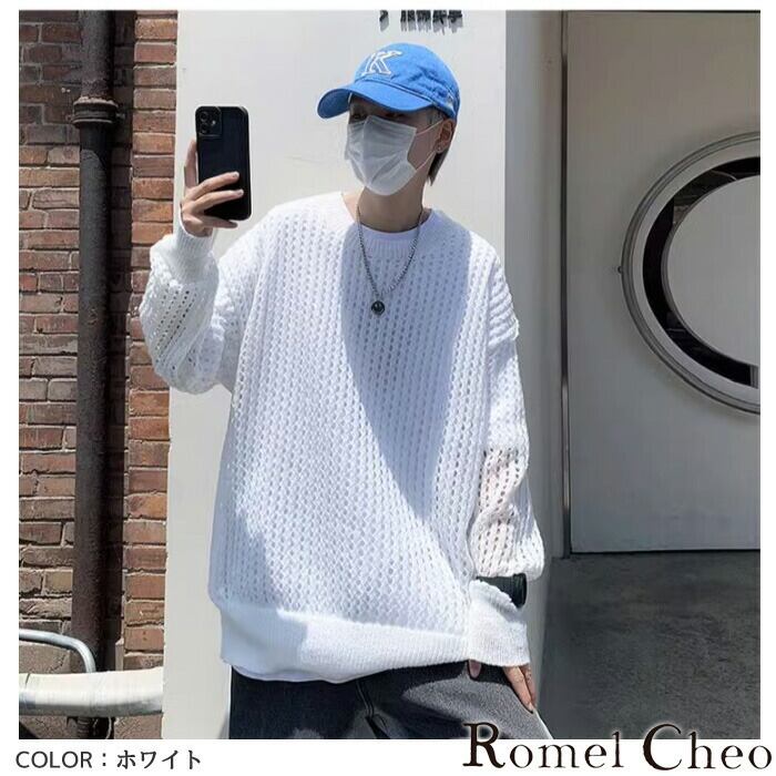 【お支払い確認後20日以内発送】RomelCheo 透かし編みドロップショルダーニット ソリッドカラーニット メッシュニット デザインニット シアーニット クルーネックニット オーバーサイズ ゆったり 長袖 メンズ モード系 ストリート 原宿系 サロン系 青文字系 ファッション 個性的 ロメルチェオ