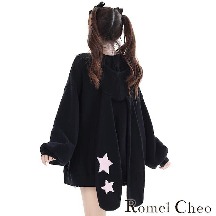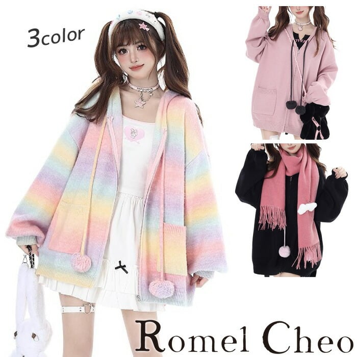 【お支払い確認後20日以内発送】RomelCheo タレ耳フード付きニットカーディガン ニットパーカー ルーズカーデ オーバーサイズ ウサ耳フード ボリューム袖 ドロップショルダー ゆったり 長袖 カジュアル ロリータ スウィートロリータ 甘ロリ 病み系 レディース モード系 ストリート 原宿系