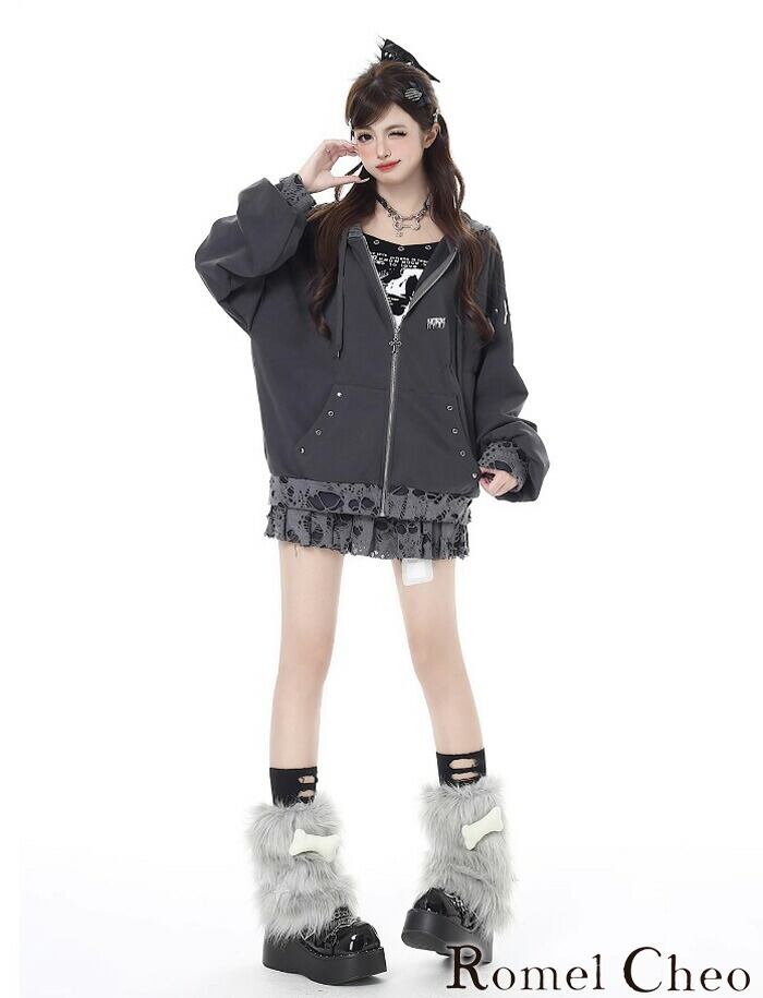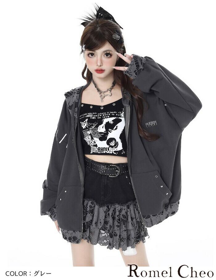 【お支払い確認後20日以内発送】RomelCheo サブカルダメージルーズパーカー オーバーサイズパーカー ジップアップパーカー ルーズシルエット 耳付きフード ドロップショルダー ボリューム袖 ド ゆったり 長袖 カジュアル ロリータ パンク 病み系 レディース モード系 ストリート 原宿系