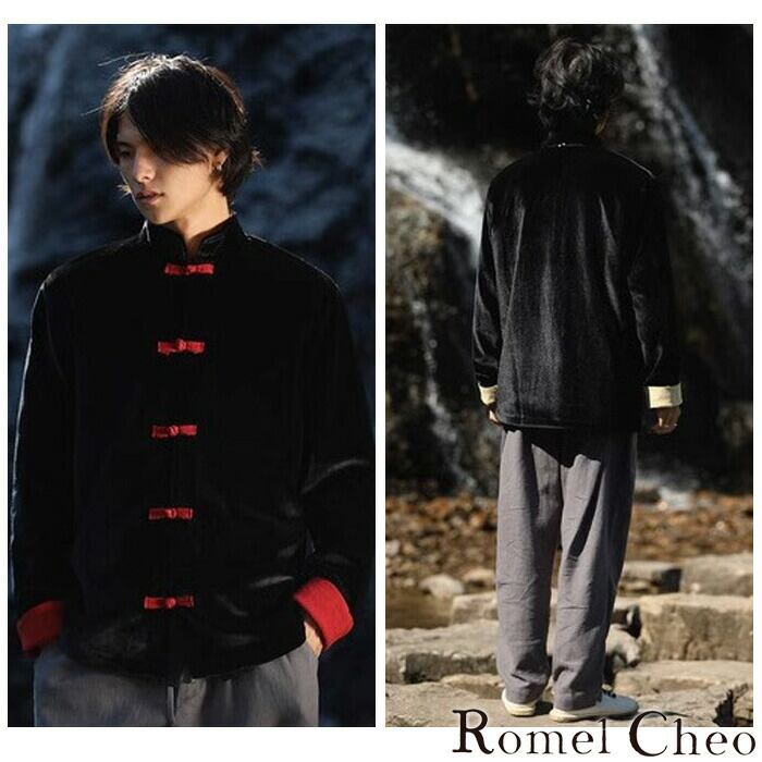 【お支払い確認後20日以内発送】RomelCheo スウェード チャイナシャツ 秋冬 チャイナボタン シャツ メンズ 漢服 チャイナシャツジャケット スタンドカラーシャツ 長袖 エスニック アジアン モード系 ストリート 原宿系 サロン系 青文字系 ファッション 個性的 ロメルチェオ