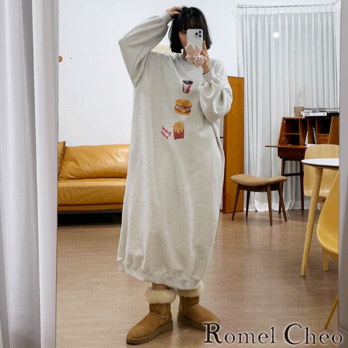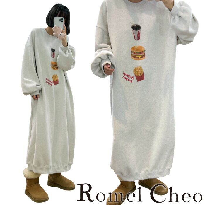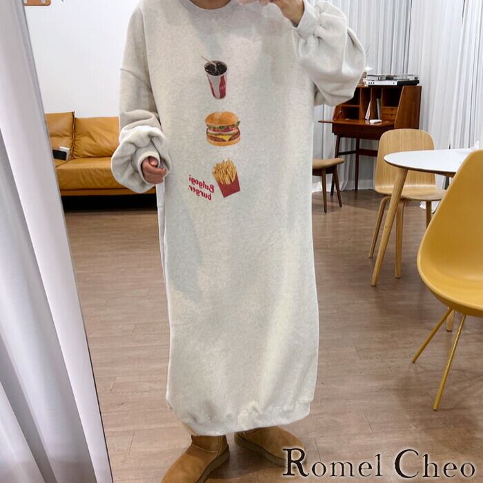 【お支払い確認後20日以内発送】RomelCheo ファーストフード ロングトレーナー 秋冬 マキシ丈 ロングスウェット 部屋着 スウェットワンピ ロングワンピ ロング丈 オーバーサイズ 大人カジュアル レディース モード系 ファッション 原宿系 青文字系 カジュアル ファッション ロメルチェオ