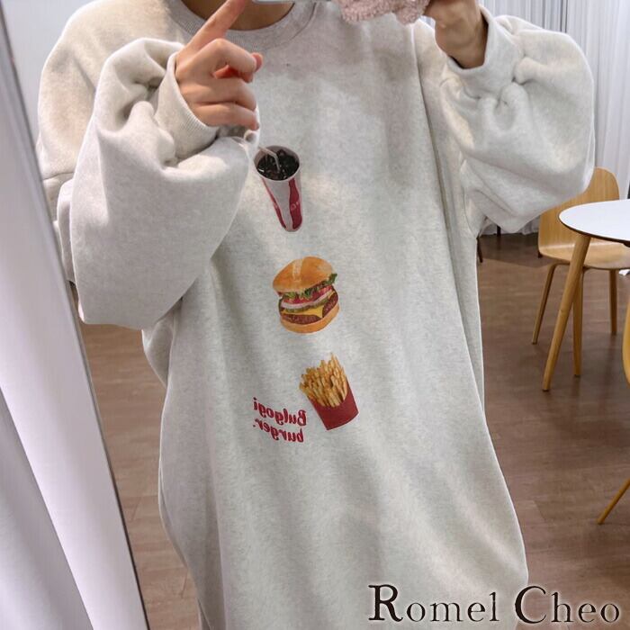 レトロ感あるファーストフードのプリントでゆるっと可愛くお洒落に着こなせるロングトレーナーになります。