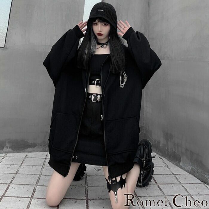 【お支払い確認後20日以内発送】RomelCheo 悪魔フード ジップパーカー レディース 病みかわ デザインパーカー ジップアップパーカー フーディー オーバーサイズ ルーズシルエット ゆったり 長袖 レディース モード系 ストリート 原宿系 サロン系 青文字系 ファッション 個性的 ロメルチェオ