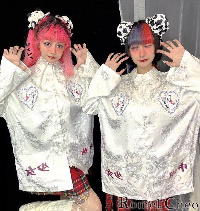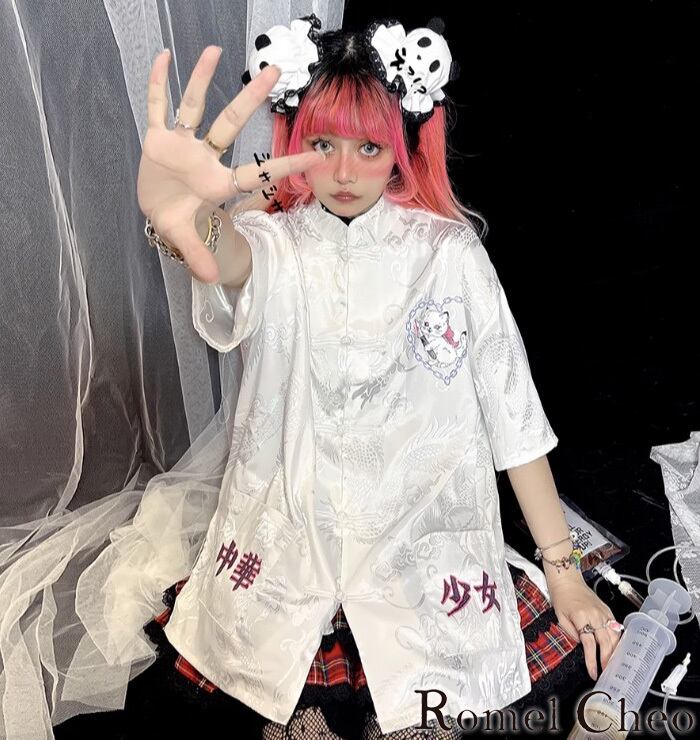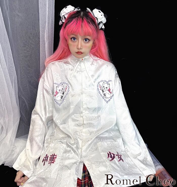 【お支払い確認後20日以内発送】RomelCheo 猫 ハート チャイナシャツ 白色 長袖 チャイナボタンシャツ 半袖 Y2K スタンドカラーシャツ デザインシャツ ロリータ カジュロリ 華ロリ 病みロリ レディース カジュアル モード系 ストリート 原宿系 青文字系 サロン系 ファッション ロメルチェオ