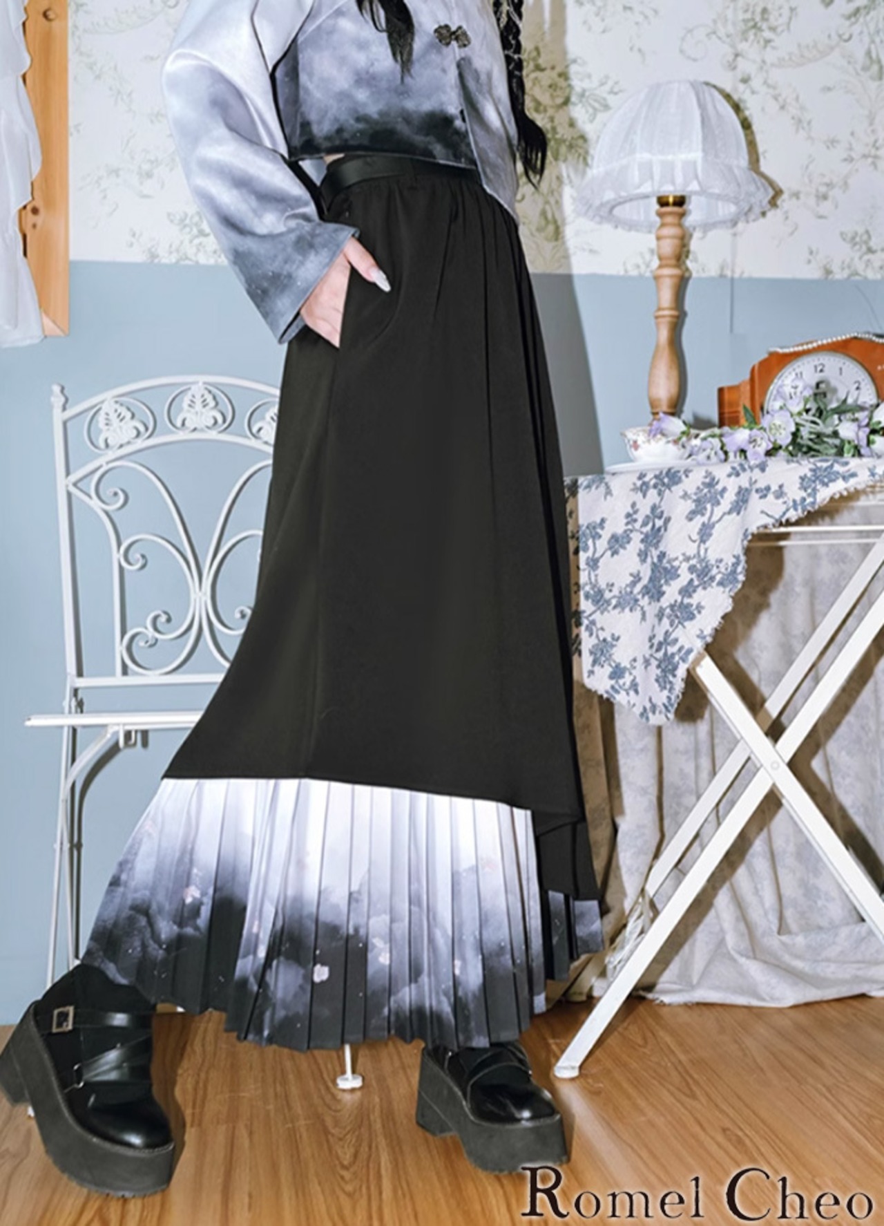 【お支払い確認後20日以内発送】RomelCheo 水墨画風 レイヤード スカート チャイナ風 和風 ロングスカート 切り替えスカート デザインスカート プリーツスカート マキシ丈 アジアン エスニック レディース カジュアル モード系 ストリート 原宿系 青文字系 サロン系 ファッション ロメルチェオ