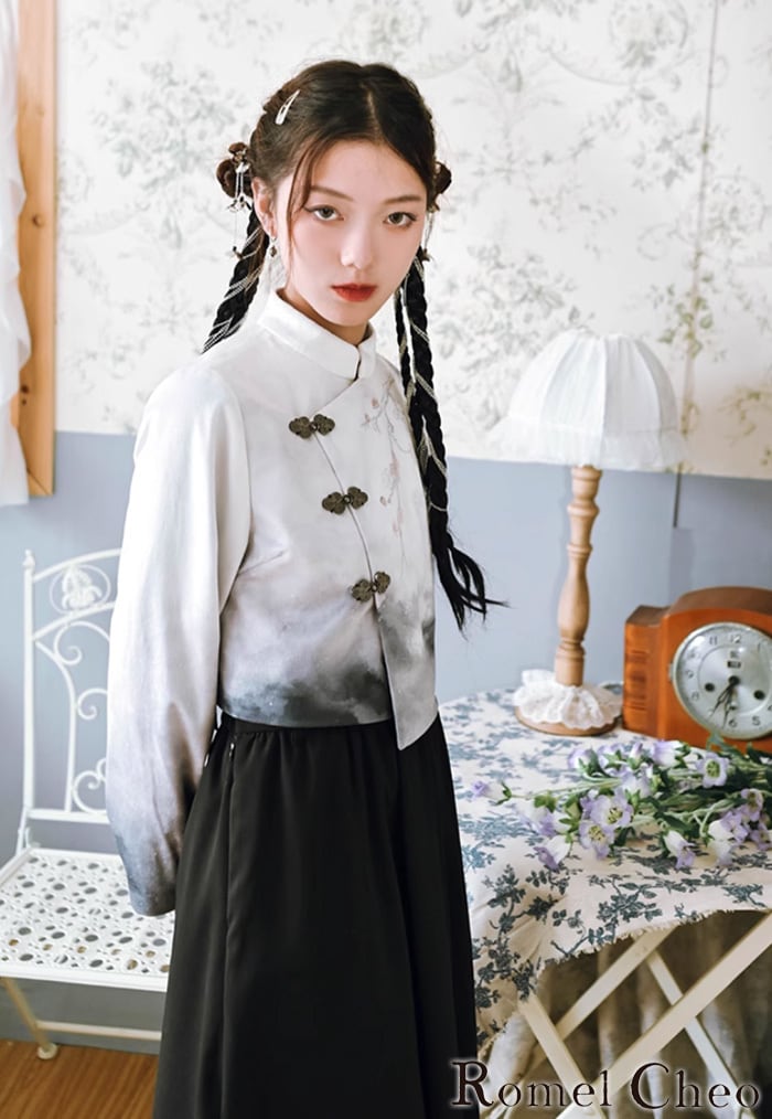 【お支払い確認後20日以内発送】RomelCheo 水墨画風 チャイナシャツ レディース チャイナボタンシャツ スタンドカラーシャツ デザインシャツ アジアン エスニック 長袖 レディース カジュアル モード系 ストリート 原宿系 青文字系 サロン系 ファッション ロメルチェオ