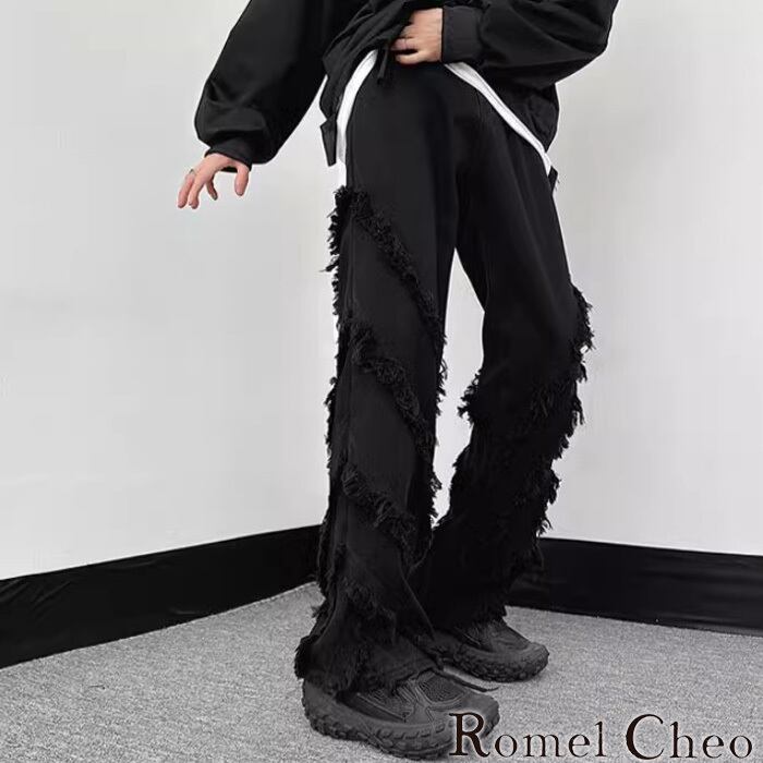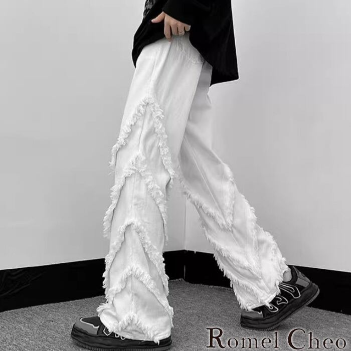 【お支払い確認後20日以内発送】RomelCheo リメイク風フリンジデニムパンツ ワイドレッグパンツ デザインパンツ ストレートパンツ ロングパンツ フリンジデニム デザインパンツ シューカット メンズ カジュアル モード系 ストリート 原宿系 青文字系 サロン系 ファッション ロメルチェオ
