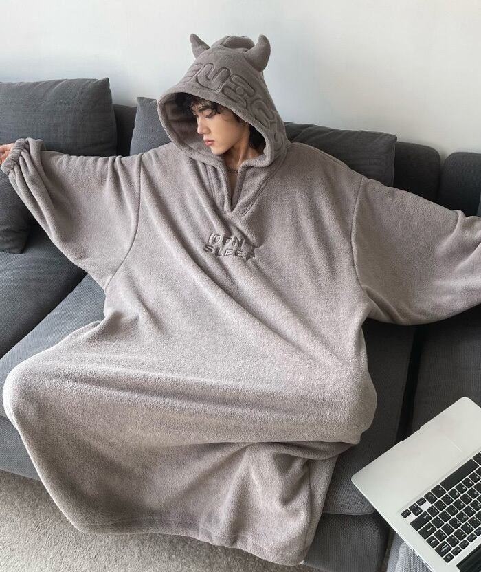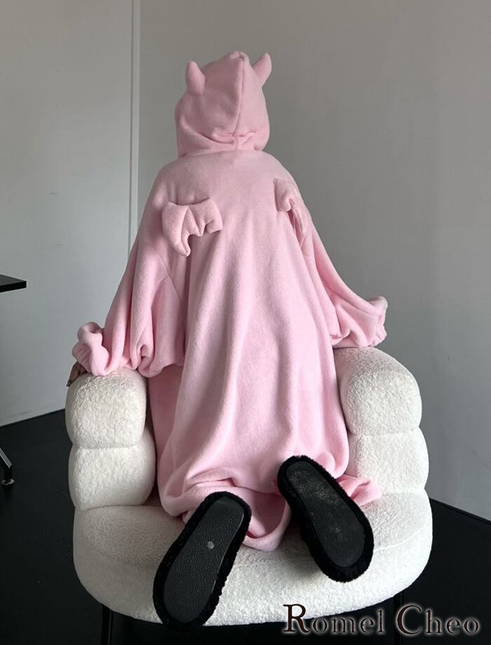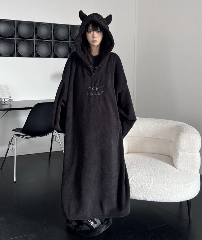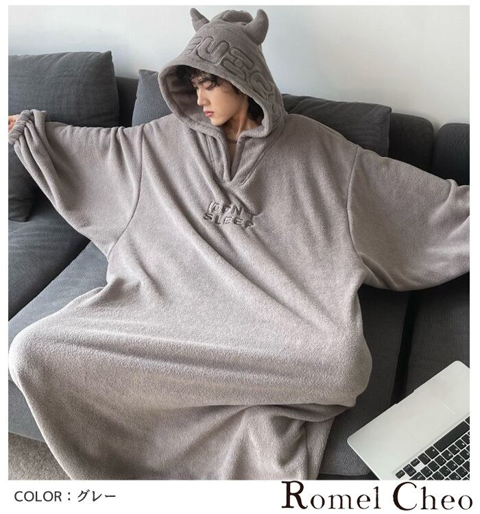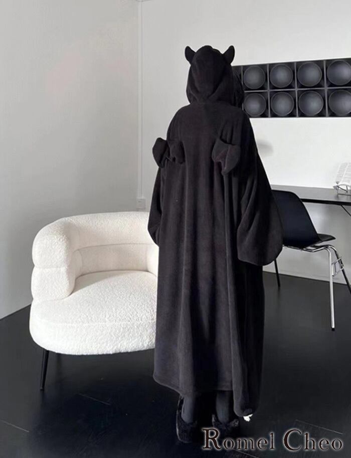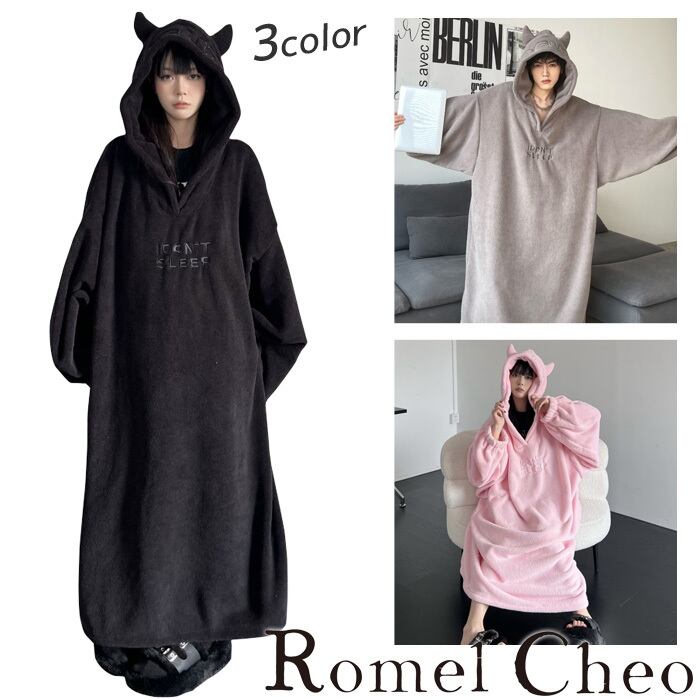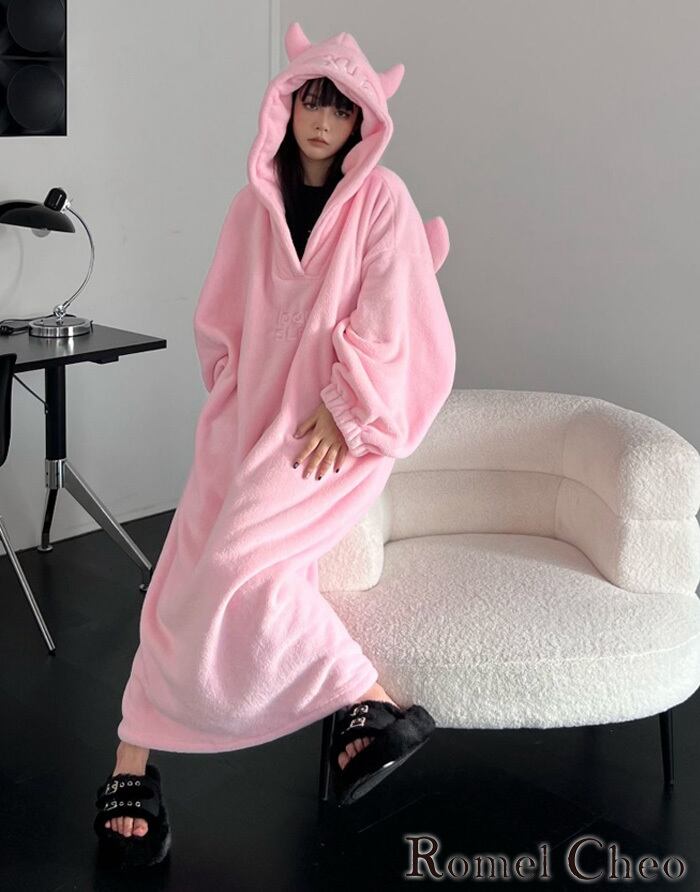 【お支払い確認後20日以内発送】RomelCheo 厚手フリースデビルロングパーカー デビルフードパーカー ロングワンピ パーカーワンピ ロング丈 オーバーサイズ ビッグパーカー ルームウェア レディース カジュアル モード系 ストリート 原宿系 青文字系 サロン系 ファッション ロメルチェオ