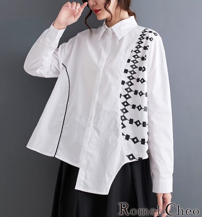 【お支払い確認後20日以内発送】RomelCheo エスニックアシメデザインシャツ アシメシャツ 切り替えシャツ デザインシャツ レギュラーカラーシャツ オーバーサイズ ゆったり 長袖 レディース カジュアル モード系 ストリート 原宿系 青文字系 サロン系 ファッション ロメルチェオ