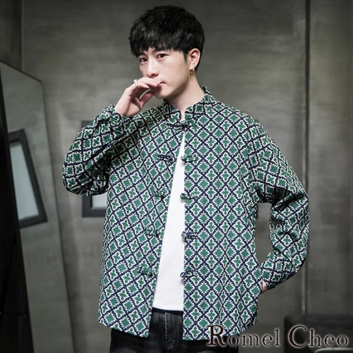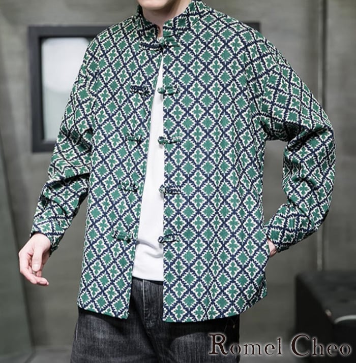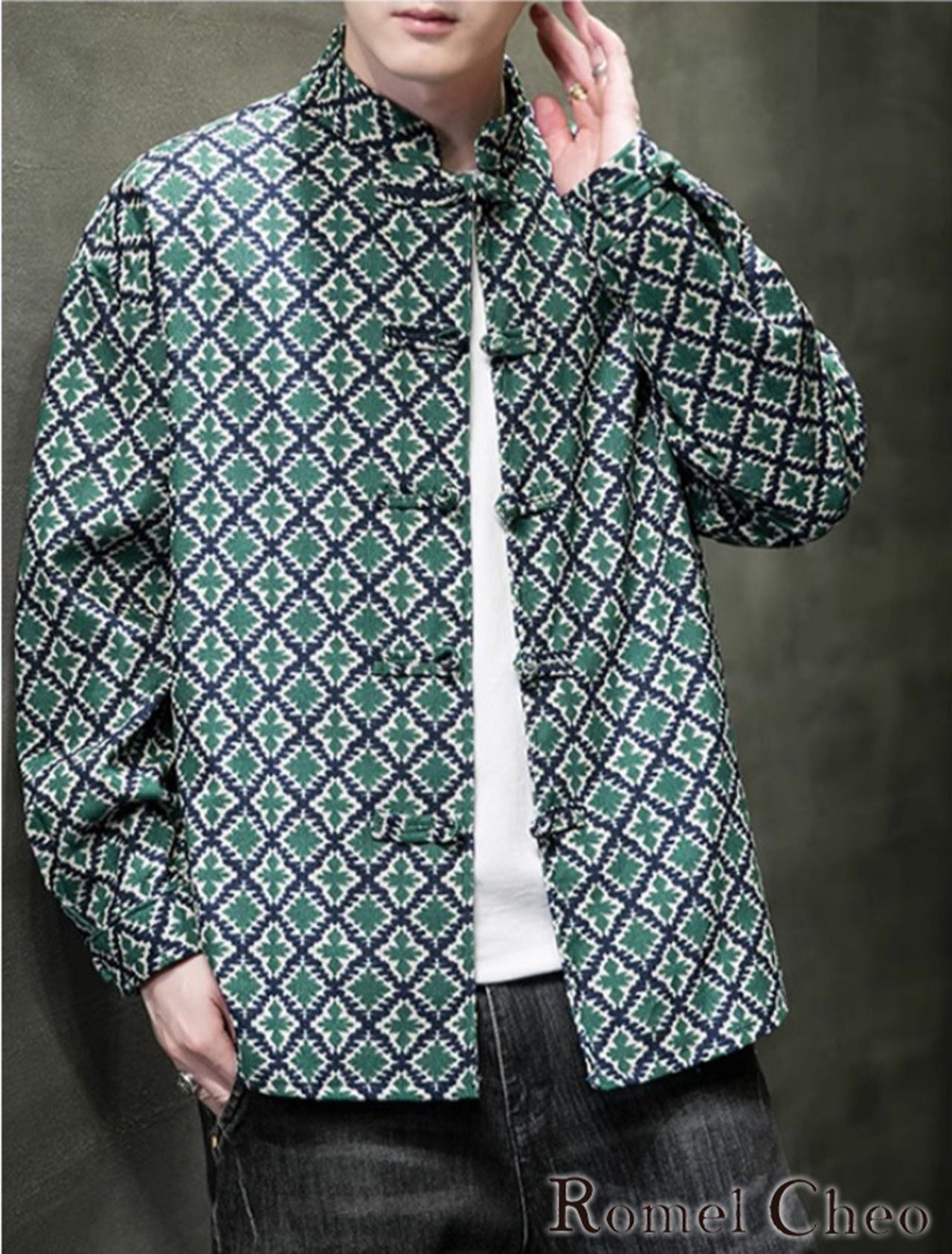 【お支払い確認後20日以内発送】RomelCheo コーデュロイ幾何学チャイナシャツ コーデュロイシャツ チャイナボタンシャツ 総柄シャツ スタンドカラーシャツ 長袖 アジアン エスニック 漢服 メンズ カジュアル モード系 ストリート 原宿系 青文字系 サロン系 ファッション ロメルチェオ
