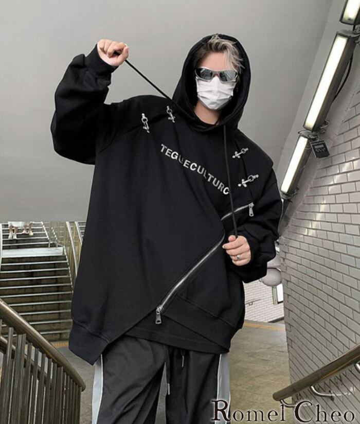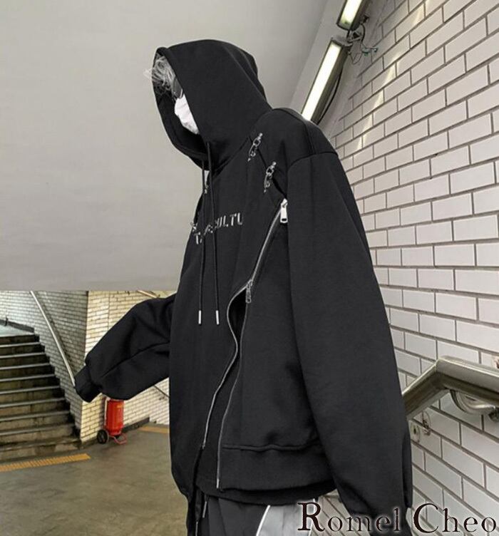 【お支払い確認後20日以内発送】RomelCheo メタルバックル斜めジップパーカー アシメパーカー オーバーサイズパーカー ボリュームパーカー プルオーバーパーカー ボリューム袖 ゆったり 長袖 メンズ カジュアル モード系 ストリート 原宿系 青文字系 サロン系 ファッション ロメルチェオ