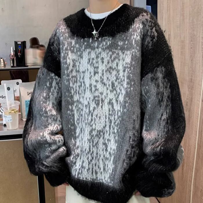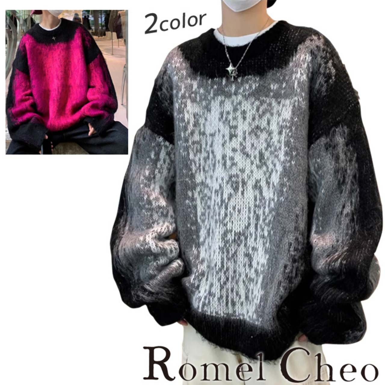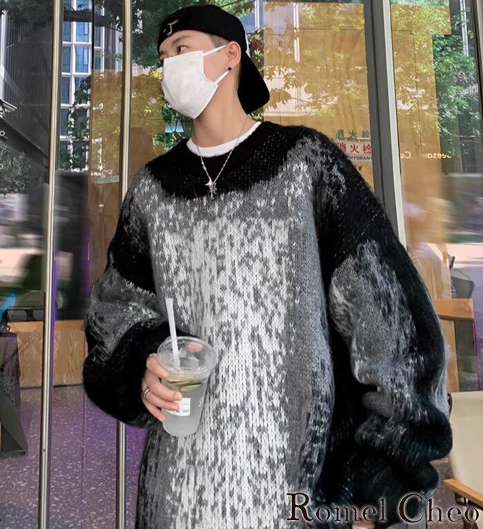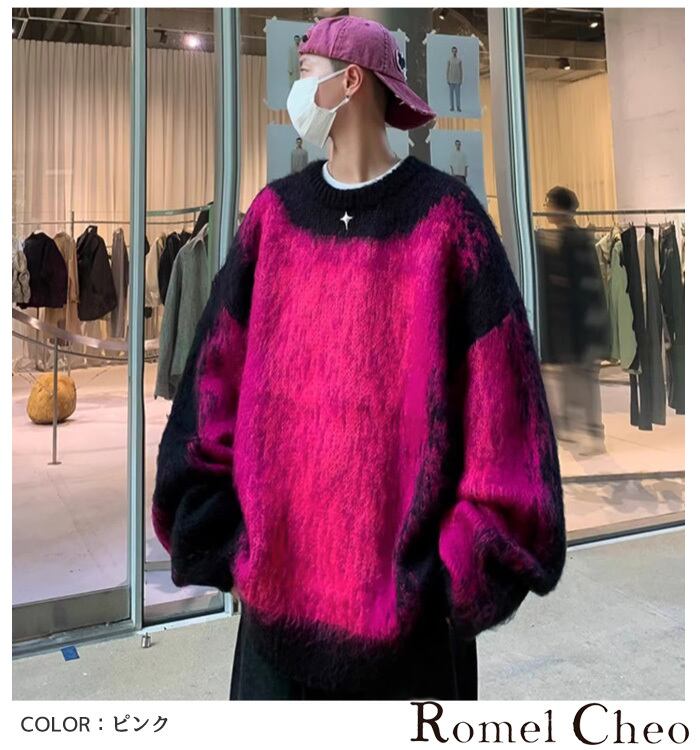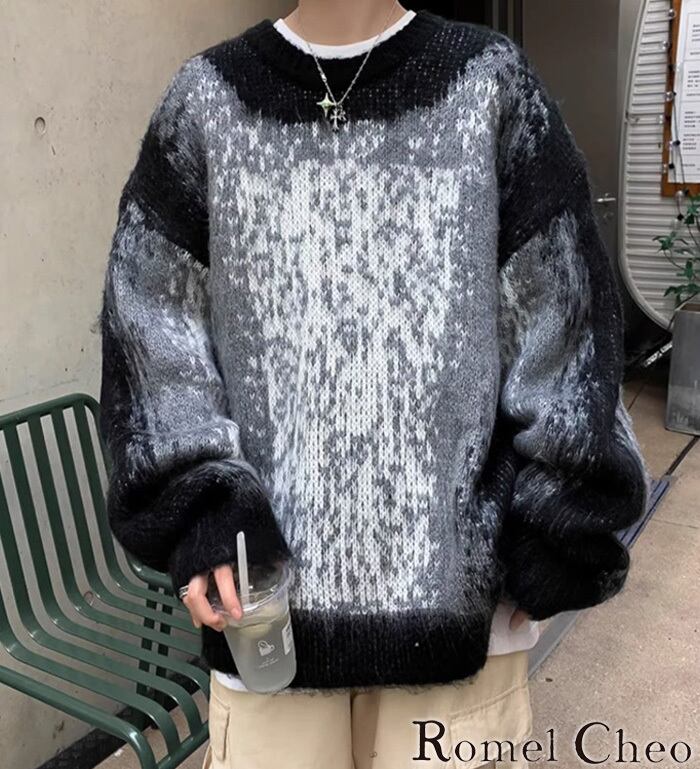 【お支払い確認後20日以内発送】RomelCheo ドーパミンカラーシャギーニット プルオーバーニット オーバーサイズニット ボリュームニット 総柄ニット カラーニット ボリューム袖 ゆったり 長袖 メンズ カジュアル モード系 ストリート 原宿系 青文字系 サロン系 ファッション ロメルチェオ