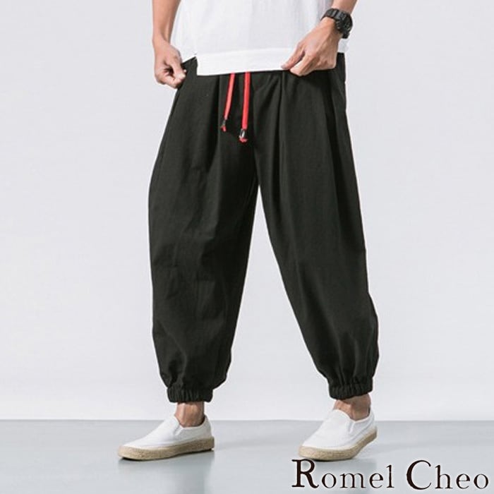 【お支払い確認後20日以内発送】RomelCheo 裾絞り タイパンツ メンズ ポリエステル ハーレムパンツ ブラック カーキ ハーレムパンツ サルエルパンツ イージーパンツ ワイドパンツ クロップドパンツ メンズ カジュアル モード系 ストリート 原宿系 青文字系 サロン系 ファッション ロメルチェオ