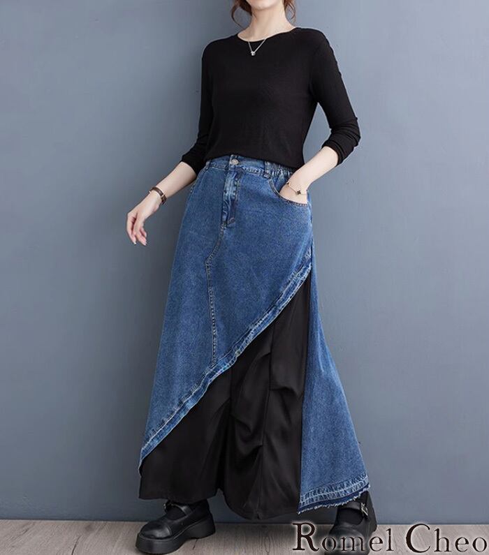 【お支払い確認後20日以内発送】RomelCheo デニム切り替えスカート デニムスカート プリーツスカート ロングスカート デザインスカート Aライン ロング丈 マキシ丈 大人カジュアル 大人可愛い レディース モード系 原宿系 青文字系 サロン系 ファッション エストール