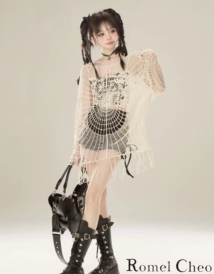 【お支払い確認後20日以内発送】RomelCheo スパイダーウェブルーズニット 中空かぎ針編みニット ルーズニット デザインニット ラウンドネックニット フィッシュネット メッシュニット ソリッドカラー 長袖 個性的 レディース モード系 ストリート 原宿系 サロン系 ファッション ロメルチェオ