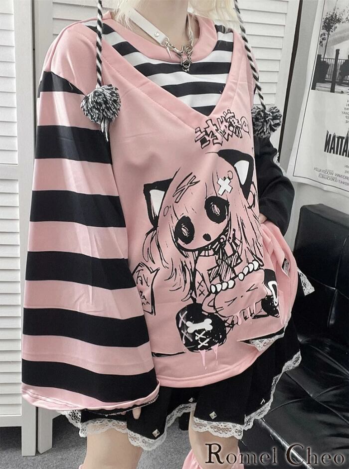 【お支払い確認後20日以内発送】RomelCheo 地雷系レッグカバー付重ね着風ロンT フェイクレイヤードロンT ボーダー ボリューム袖 長袖 レッグアクセ レッグウェア 個性的 原宿系 ロリータ パンク 病み系 レディース モード系 ストリート 原宿系 サロン系 ファッション ロメルチェオ