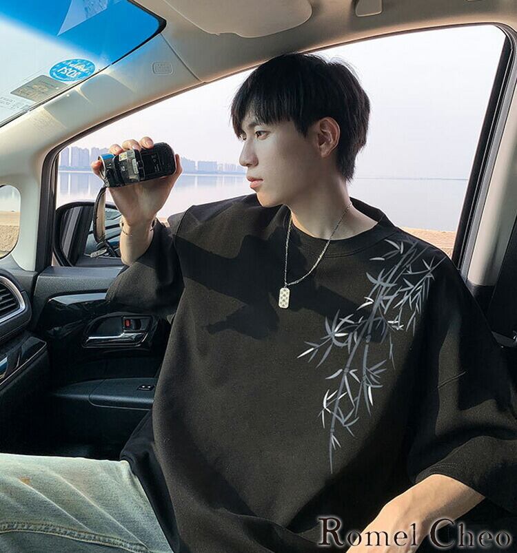 【お支払い確認後20日以内発送】RomelCheo チャイナバンブー半袖Tシャツ グラフィックTシャツ オーバーサイズ Tシャツ 半袖 ゆったり ルーズ ドロップショルダー クルーネック モノトーン アジアン エスニック メンズ モード系 ストリート 原宿系 サロン系 ファッション ロメルチェオ