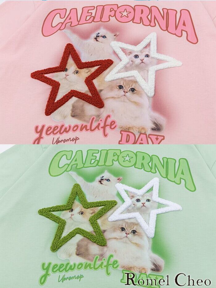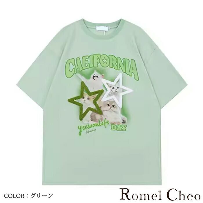 【お支払い確認後20日以内発送】RomelCheo スターキャットアメカジポップTシャツ アニマルプリントTシャツ グラフィックTシャツ オーバーサイズTシャツ ゆったり カットソー 半袖 クルーネック レディース モード系 ストリート 原宿系 サロン系 ファッション ロメルチェオ
