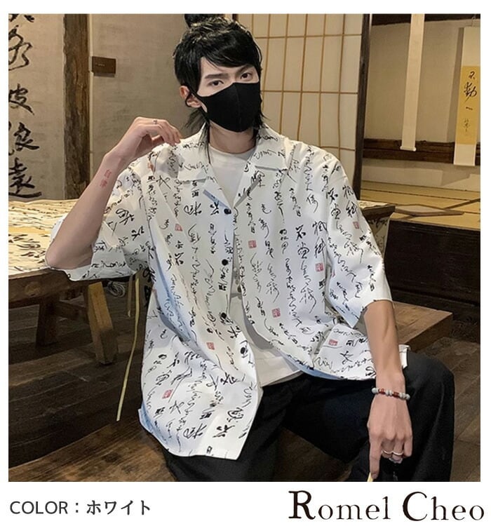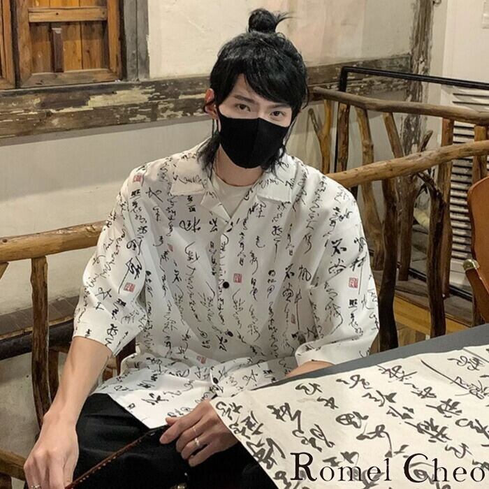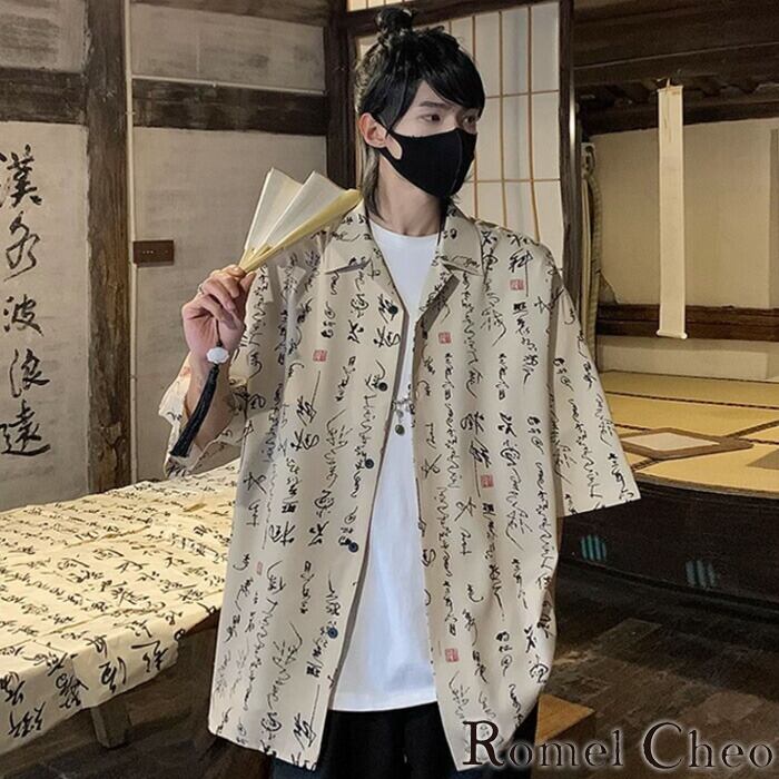 【お支払い確認後20日以内発送】RomelCheo 筆文字柄半袖シャツジャケット オーバーサイズシャツ ルーズシルエット ゆったり 開襟シャツ オープンカラーシャツ 総柄シャツ 半袖 アジアン エスニック 和柄 メンズ モード系 ストリート 原宿系 サロン系 ファッション ロメルチェオ