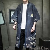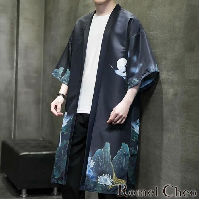 【お支払い確認後20日以内発送】RomelCheo 月夜和柄七分袖羽織カーディガン 和柄カーディガン ロングカーディガン 羽織 法被 着物カーディガン ドロップショルダー 半袖 七分袖 ゆったり ルーズ レトロ モダン メンズ モード系 ストリート 原宿系 サロン系 ファッション ロメルチェオ