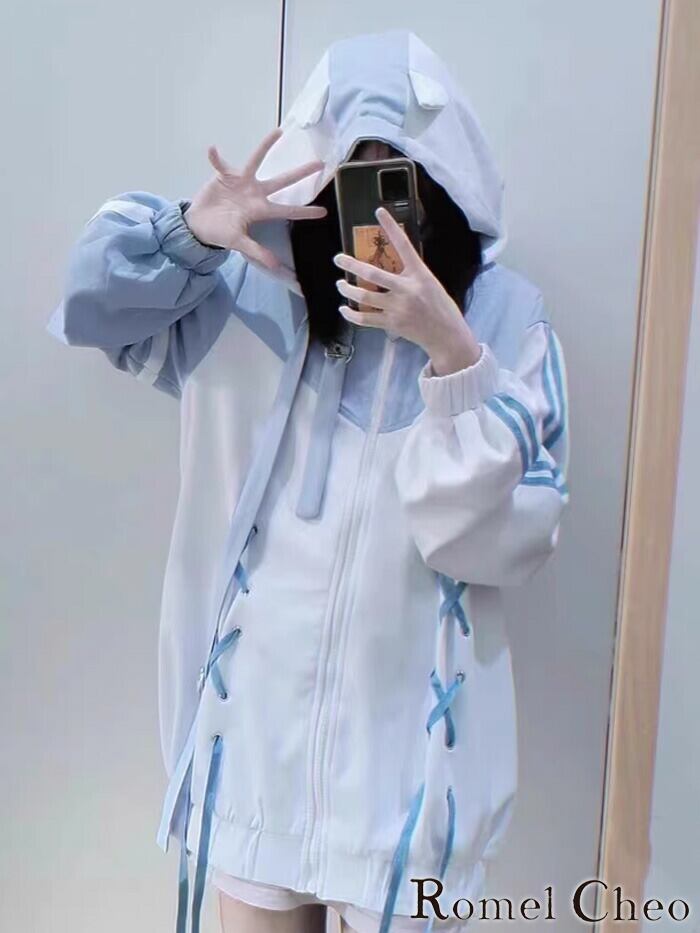 【お支払い確認後20日以内発送】RomelCheo 猫耳 編み込みラインパーカー 地雷系 ジップアップパーカー 切り替えパーカー デザインパーカー サイドラインパーカー オーバーサイズ ゆったり 長袖 ロリーター 病み系 レディース モード系 ストリート 原宿系 サロン系 ファッション ロメルチェオ